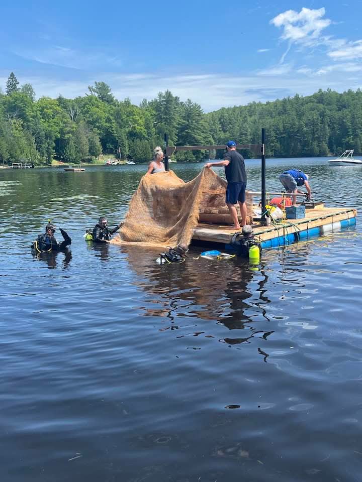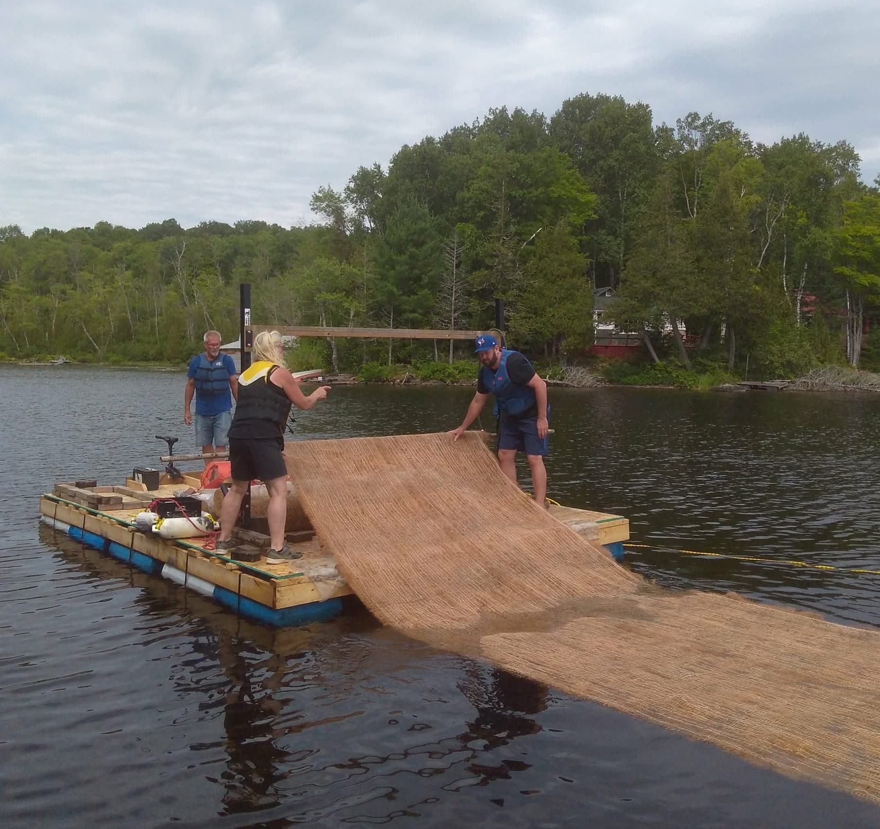 Since the 2017 confirmation of the presence of Eurasian Milfoil, Wollaston Lake has seen the spread of Eurasian Milfoil in several areas of the Lake. We have conducted workshops, purchased equipment available on loan for manual removal, installed benthic mats in the big lake, and continue to set up markers to warn boaters of some of these most prominent Milfoil Beds (based on bed size and location related to recreational boat traffic). We are working to get permits from the MNRF to support containment methods including mechanical harvesting, diver extraction, and benthic mat deployment.